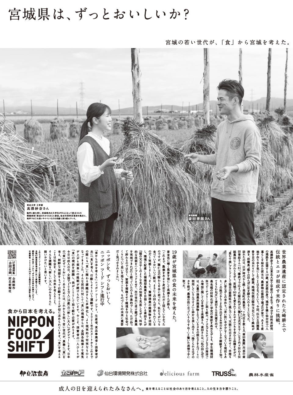 訪れたのは、江戸時代から続く美里町の農家で、7代目を数える「斎田農園」代表の斎田善郎さん(41)。藩政下で広まった稲の杭がけ「穂仁王(横ルビ=ほんにょ)式天日干し」など代々伝わる伝統農法にこだわりながら、宮城で60年も愛されてきたササニシキを含む6品種を手がけ、“恩むす美”ブランドとして独自の販路拡大に挑んでいる。天候に左右されやすく、手間も多い昔ながらの米作り。「若い担い手が少なくなっている現状もあり、この地だからこそ生み出せるお米のおいしさや価値をより知ってもらわねば」と斎田さんは決意を示す。