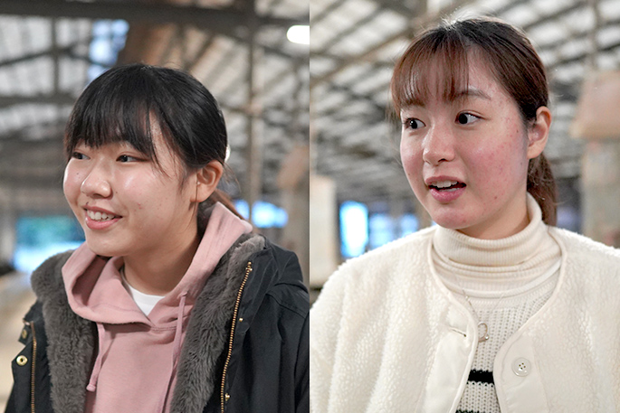 西村茉奈美さんは島根大学法文学部で財政学を学ぶ21歳。同じ学部に通う19歳の木瀬春香さんは歴史学を専攻している。2人は今回初めて、「しまね和牛」の生産現場を訪れた。