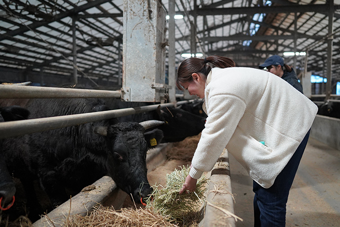 2人が訪問したのは、出雲市内2カ所で約500頭を育てる藤増牧場。この牧場の和牛肉は2022年に開催された全国和牛能力共進会の第6区(総合評価群肉牛群)で全国1位に輝くなど高い評価を受けている。