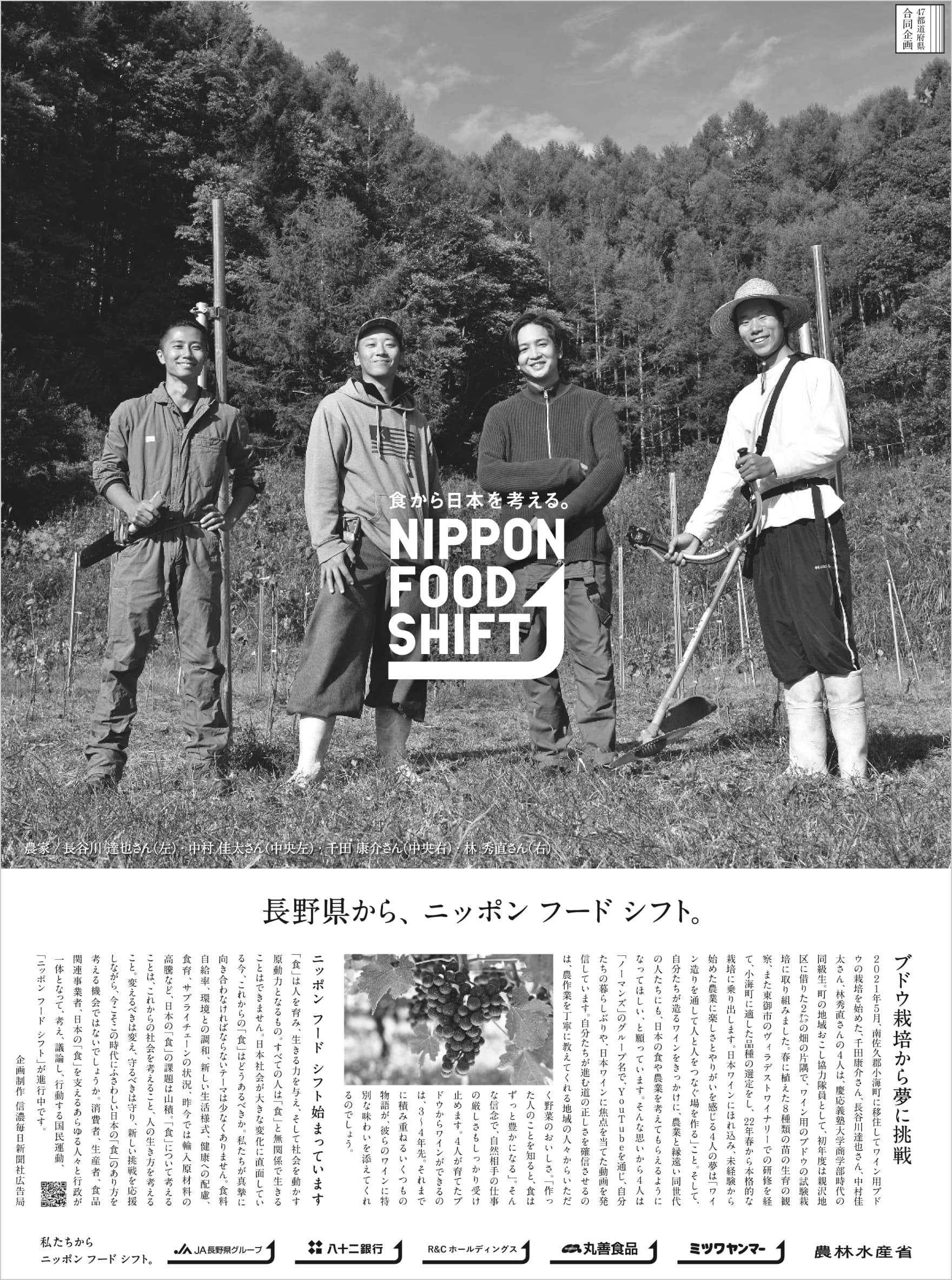 2021年5月、南佐久郡小海町に移住してワイン用ブドウの栽培を始めた、千田康介さん、長谷川達也さん、中村佳太さん、林秀直さんの4人は、慶応義塾大学商学部時代の同級生。町の地域おこし協力隊員として、初年度は親沢地区に借りた2㌶の畑の片隅で、ワイン用のブドウの試験栽培に取り組みました。春に植えた8種類の苗の生育の観察、また東御市のヴィラデストワイナリーでの研修を経て、小海町に適した品種の選定をし、22年春から本格的な栽培に乗り出します。日本ワインにほれ込み、未経験から始めた農業に楽しさとやりがいを感じる4人の夢は「ワイン造りを通して人と人をつなぐ場を作る」こと。そして、自分たちが造るワインをきっかけに、農業と縁遠い同世代の人たちにも、日本の食や農業を考えてもらえるようになってほしい、と願っています。そんな思いから4人は「ノーマンズ」のグループ名で、YouTubeを通じ、自分たちの暮らしぶりや、日本ワインに焦点を当てた動画を発信しています。自分たちが進む道の正しさを確信させるのは、農作業を丁寧に教えてくれる地域の人々からいただく野菜のおいしさ。「作った人のことを知ると、食はずっと豊かになる」。そんな信念で、自然相手の仕事の厳しさもしっかり受け止めます。4人が育てたブドウからワインができるのは、3~4年先。それまでに積み重ねるいくつもの物語が、彼らのワインに特別な味わいを添えてくれるのでしょう。