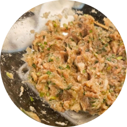 - 豚ひき肉、鶏ガラスープ、水、オイスターソース、ごま油、ラード、黒胡椒をボウルにいれて混ぜる